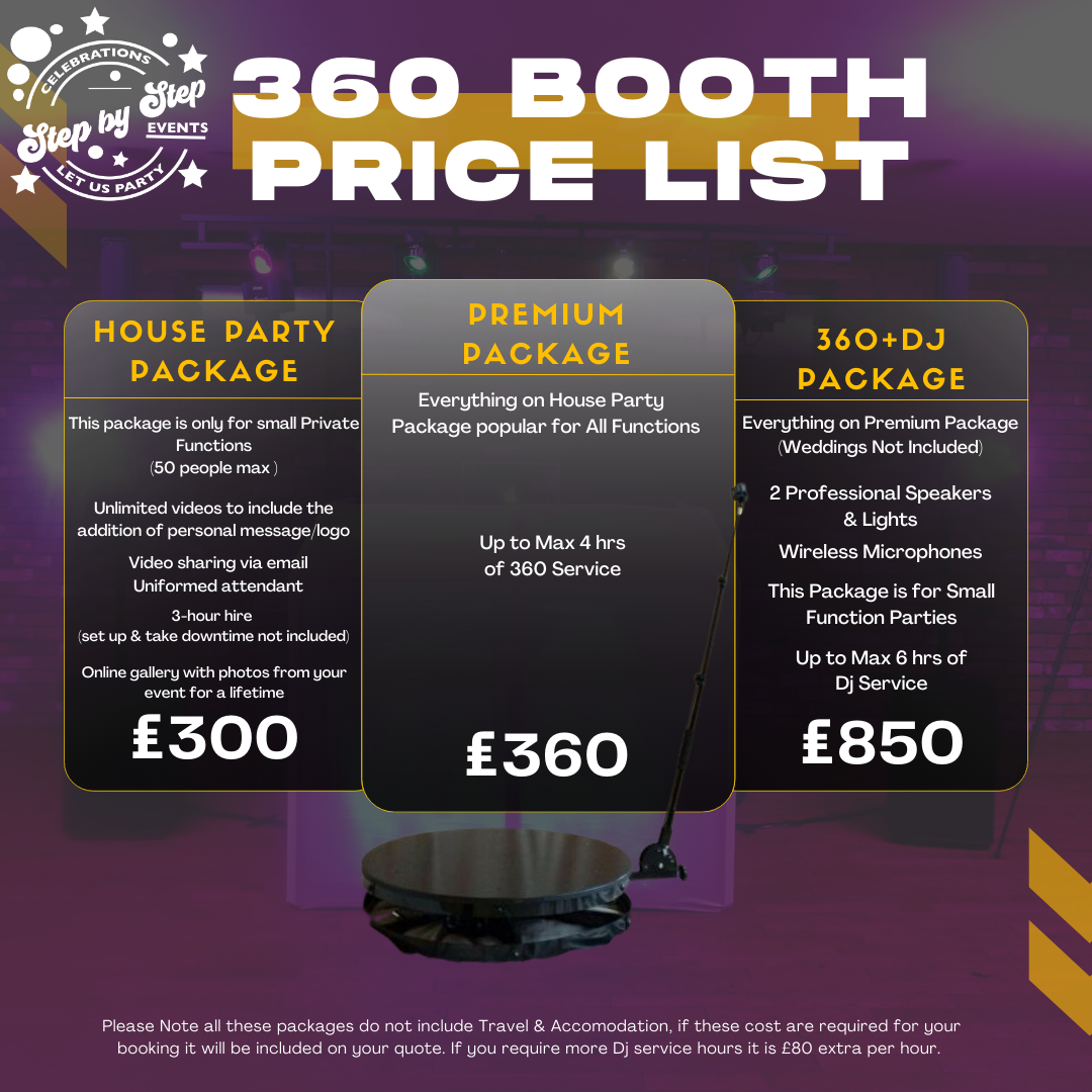 With our 360 photobooth package, you can capture memories at events such as weddings, parties, and corporate events visitors a unique, engaging experience that they won't forget. Contact us today to book your 360 photobooth package.